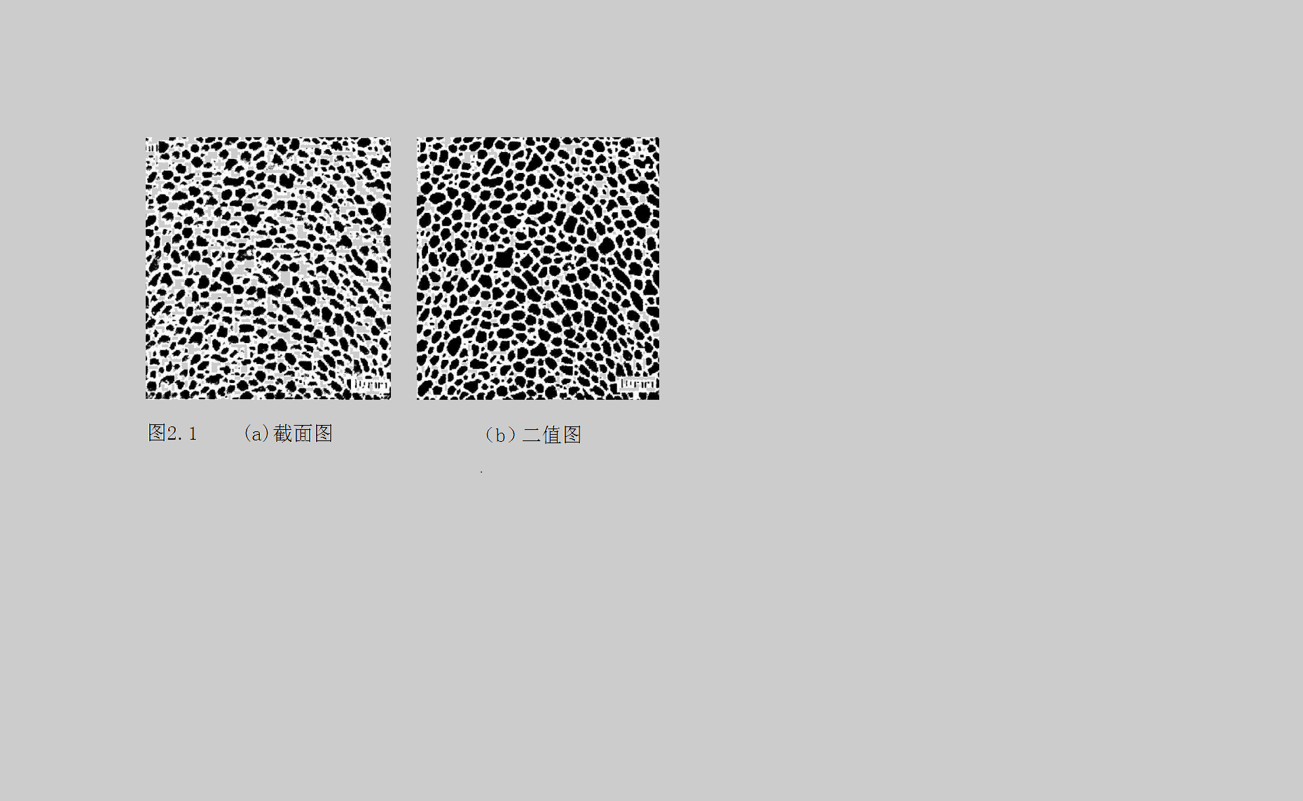 研究所用泡沫铝样品由本课题组制备,泡沫铝样品的制备步骤包括:(1)将铝锭在坩埚中熔化并升温到973K后进行保温(该温度即为发泡温度);(2)在700r/min的搅拌速度下,均匀地将计量好的新型发泡剂加入铝熔体中,发泡剂加完后再继续搅拌1min,提起搅拌桨,然后在该温度下保温1min,最后将坩埚提出熔炼电炉,空气冷即制得泡沫铝样品。图2.1(a) 所示为所制备泡沫铝线切割后所获得截面的宏观数码照片,该截面经过了表面化学镀处理,因而在其孔洞与孔筋之间产生了适当的反差。图2.1(b)所示为经过图2.1(a)所示截面经过图像处理后所得二值化图像,图像二值化是指将彩色图像或者灰度图转化成只有黑白两种颜色图像的过程,其特点是:得到的图像在存储矩阵中只用0和1来代表图像中黑白像素点,所以图像分析软件处理二值化图像时,图像的阀值容易选取,且速度快精度高。