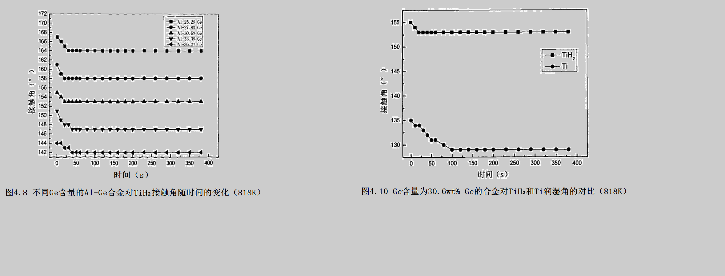 图4.10所示为818K,Ge含量为30.6%的A1-Ge合金对TiH₂和Ti润湿角的对比。从图中可以看出:钛板的接触角明显小于氢化钛的,相差25°。随时间的变化氢化钛很快就达到了平衡(约50s);而钛板却需要更长的时间才能达到平衡(约100s)。