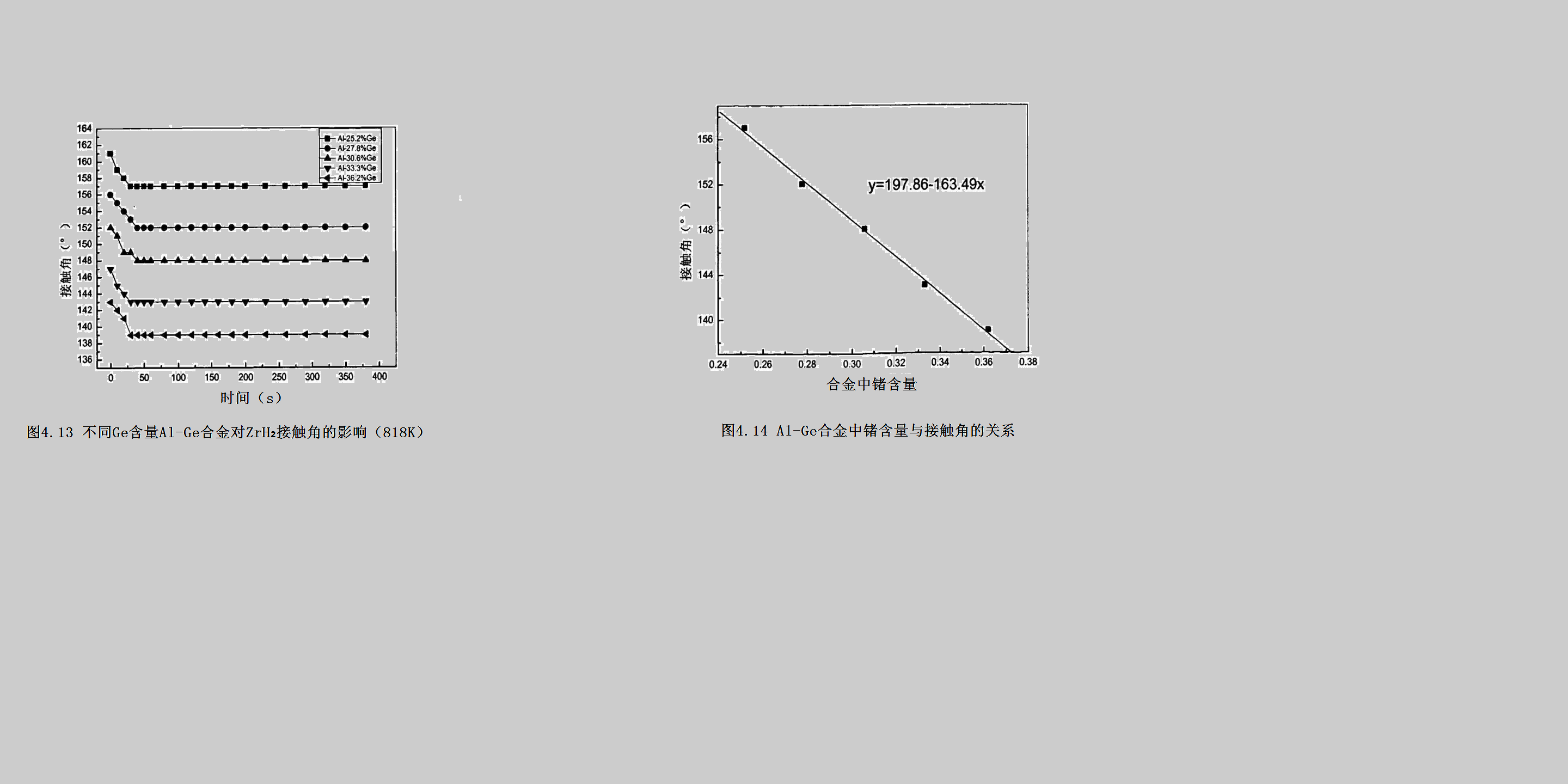 图4.13不同含量的Al-Ge合金对ZrH₂所得到的接触角随时间的变化。与图4.8相似接触角随时间的变化不明显,并在较短的时间内(约45s)内就达到了平衡。随着锗含量从25.2%增加到36.2%,接触角逐渐减小,约减小了18°,说明在所测量的锗含量的变化范围内ZrH₂要比TiH₂接触角的变化大,并且合金中锗含量与接触角具有一定的线性关系(如图4.14)。